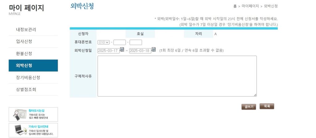 外泊申請は1~6日の外泊が申請可能です。7日以上の外泊の場合は장기비움신청 (長期空き申請)で申請しましょう。長期空き申請の場合も下記の手順で申請できます。