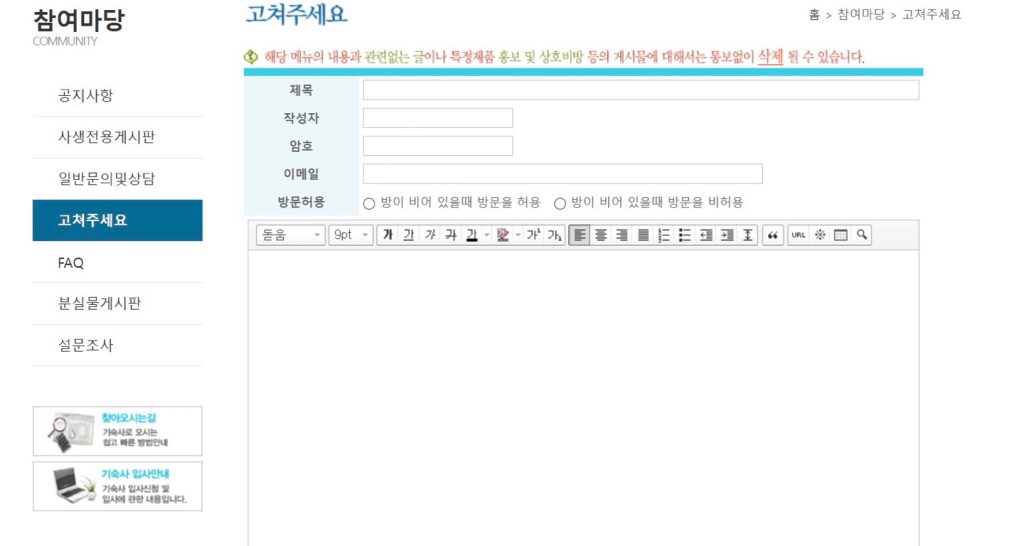 その他の相談(騒音被害やお酒やたばこをしている人を見つけたなど)は사생전용게시판 (掲示板)に、問い合わせや質問は일반문의및상담 (問い合わせ)に!
